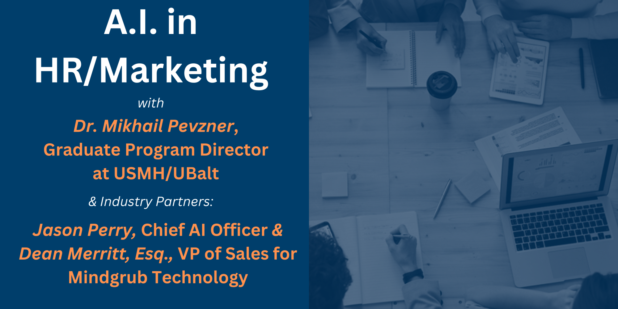 Join us for a provocative discussion on the business implications of artificial intelligence (AI) in marketing and HR with Mikhail Pevzner, PhD, Graduate Program Director at the University of Baltimore’s Merrick School of Business; Jason Perry, a seasoned executive and Fractional Chief AI Officer; and Dean Merritt, VP of Sales at Mindgrub Technologies. Learn how you can leverage the power of AI to improve the way you operate, from predicting employee turnover and helping to remove unconscious bias from recruitment processes, to generating personalized marketing at scale and boosting customer conversions with real-time engagement. Our goal is to help you gain practical insights on leveraging AI while avoiding common pitfalls. Don’t miss this chance to stay ahead in the AI-driven business landscape!