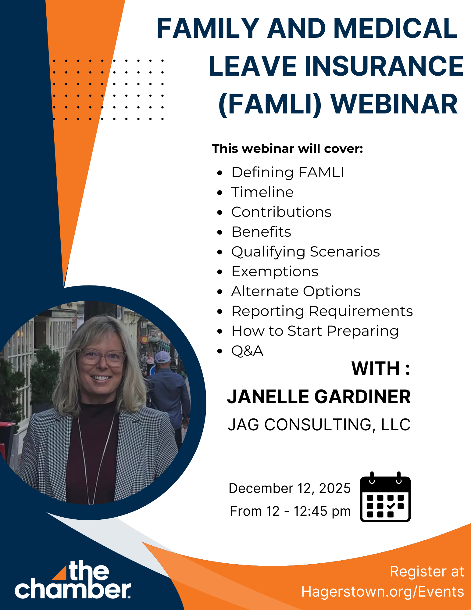 To help you prepare and plan, we have partnered with Janelle Gardiner, JAG Consulting, to present information on Maryland’s impending Family and Medical Leave Insurance program (FAMLI) on Friday, December 12, from 12:00–12:45 pm, via Zoom.