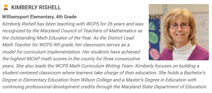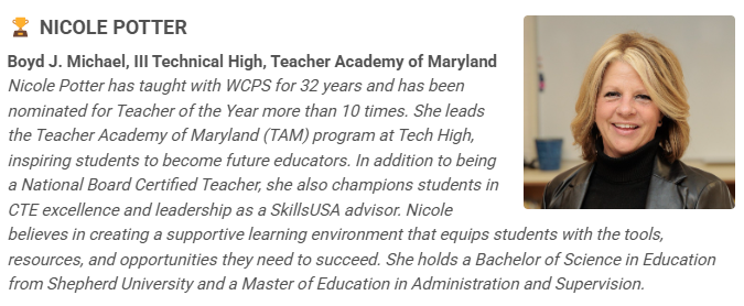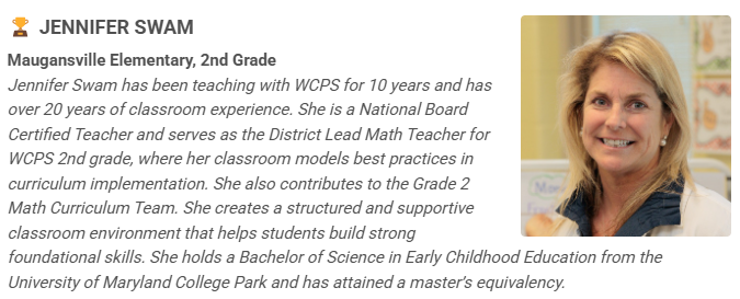 This dinner event will celebrate our educators in Washington County! During the awards ceremony, WCPS will honor the educators that have been named finalists for the distinguished "Washington County Teacher of the Year" title. Then, the 2025-2026 winner will be announced!